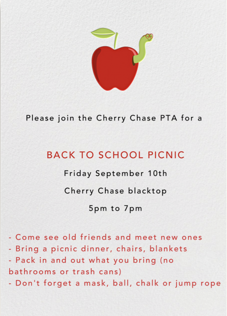 While it’s wonderful to see kids back on campus, this year is still different and special in it’s own way. In lieu of a formal Back-to-School Night, join other families for a Family Play Date on the Cherry Chase public park playground! Bring a picnic blanket and your dinner to enjoy on the grass – socially distanced and around your grade cohort.